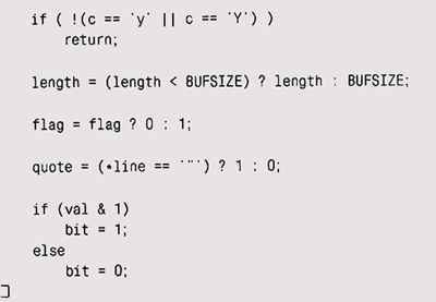 но с ними фрагмент станет гораздо проще для понимания: lеар_уеаг = ((у%4 == 0) && (у%100 != 0)) | (у%400 ==0); Мы убрали здесь некоторые пробелы: группировка операций с самым высоким приоритетом помогает читателю быстрее разобраться в структуре программы. Разбивайте сложные выражения. Языки С, C++ и Java имеют богатый и разнообразный синтаксис, поэтому многие увлекаются втискиванием всего подряд в одну конструкцию. Приведенное выражение весьма компактно, однако в нем содержится слишком много операторов: *х += (*xp=(2*k < (n-m) ? c [k+1] : d[k--])); Если разбить это выражение на несколько, оно станет гораздо более удобочитаемым: if (2*k < n-m) Будьте проще. Безудержная энергия программистов иногда направляется на то, чтобы написать наиболее краткий код или достичь результата самым хитрым и красивым способом. Иногда, впрочем, эти таланты тратятся впустую: настоящая задача в том, чтобы написать код попроще, а не похлеще. Вот, к примеру, что делает это замысловатое выражение? ? subkey = subkey » (bitoff - ((bitoff » 3) « 3)); Самое внутреннее выражение сдвигает bitoff на три бита вправо. Результат сдвигается обратно влево, при этом три сдвинутых бита замещаются нулями. Затем результат вычитается из первоначального значения, оставляя три младших бита bitoff, которые используются для сдвига subkey вправо. Таким образом, приведенная конструкция эквивалентна subkey = subkey » (bitoff & 0x7); Над первой версией приходится гадать некоторое время, чтобы понять, что там происходит; со второй же все просто и ясно. Опытные программисты записали бы ее еще короче: subkey »= bitoff & 0x7; Некоторые конструкции кажутся специально созданными для того, чтобы сбить читателя с толку. Например, применение оператора ? : может привести к появлению абсолютно загадочного кода: ? child=(!LC&&!RC)?0:(!LC?RC:LC); Согласитесь, что, только разобрав все возможные варианты сравнений, можно догадаться, что же делает этот фрагмент. Приведенная ниже конструкция длиннее, но значительно проще, потому что возможные варианты видны сразу: f (LC == 0 && RC == 0) Операция ? : хороша только для коротких и простых выражений-, где она может заменить четыре строки if-else одной, как в следующем примере: max = (а > b) ? а : b; или даже в таком случае: printf("The list has %d item%s\n", n, n==1 ? ""