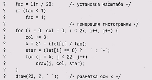 | Загадочные числа Загадочные числа — это константы, размеры массивов, позиции символов и другие числовые значения, появляющиеся в программе непосредственно, как "буквальные константы". Давайте имена загадочным числам. В принципе нужно считать, что любое встречающееся в программе число, отличное от 0 и 1, является загадочным и должно получить собственное имя. Просто "сырые" числа в тексте программы не дают представления об их происхождении и назначении, затрудняя понимание и изменение программы. Вот отрывок из программы, которая печатает гистограмму частот букв на терминале с разрешением 24 X 80. Этот отрывок неоправданно запутан из-за целого сонма непонятных чисел: