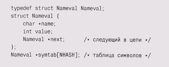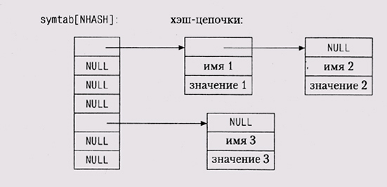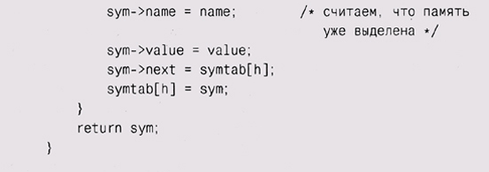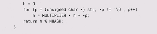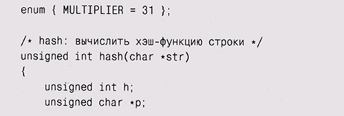 то хэш-функция вычисляется дважды. Насколько большим должен быть массив? Основная идея заключается в том, что он должен быть достаточно большим, чтобы любая хэш-цепочка была бы длиной всего в несколько элементов и поиск занимал время О(1). Например, у компилятора размер массива должен быть порядка нескольких тысяч, так как в большом исходном файле — несколько тысяч строчек и вряд ли различных идентификаторов имеется больше, чем по одному на строчку кода. Теперь нам нужно решить, что же наша хэш-функция, hash, будет вычислять. Она должна быть детерминированной, достаточно быстрой и распределять данные по массиву равномерно. Один из наиболее распространенных алгоритмов хэширования для строк получает хэш-значение, добавляя каждый байт строки к произведению предыдущего значения на некий фиксированный множитель (хэш). Умножение распределяет биты из нового байта по всему до сих пор не считанному значению, так что в конце цикла мы получим хорошую смесь входных байтов. Эмпирически установлено, что значения 31 и 37 являются хорошими множителями в хэш-функции для строк ASCII.