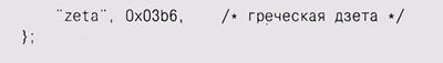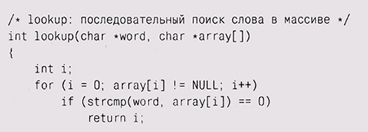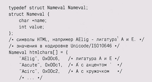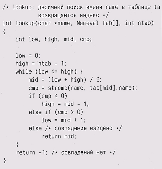 Для двоичного поиска таблица должна быть отсортирована, как в данном случае (в любом случае это полезно; люди тоже быстрее находят требуемое в отсортированных таблицах), а также должно быть известно, сколько элементов в таблице. Здесь может помочь макрофункция NELEMS из первой главы: printf("Ta6лица HTML содержит %d слов\n", NELEMS(htmlchars));