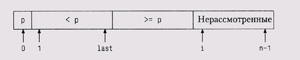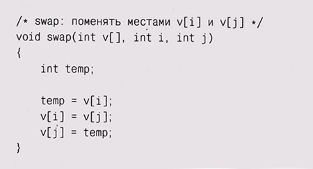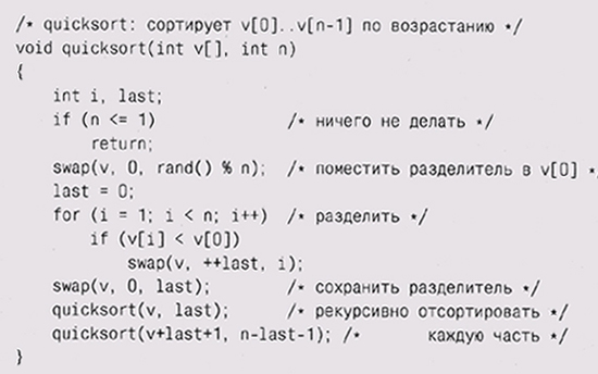 Когда этот процесс закончится, то массив будет отсортирован. Быстрая сортировка работает быстро, потому что, как только мы узнаем, что элемент меньше, чем разделитель, нам уже не нужно его сравнивать с большими элементами; аналогично, большие элементы не сравниваются с маленькими. Поэтому данный алгоритм существенно быстрее, чем такие простые методы сортировки, как сортировка вставкой или пузырьком, когда каждый элемент сравнивается напрямую со всеми остальными. Алгоритм быстрой сортировки практичен и эффективен; он хорошо изучен, и существует множество его вариаций. Версия, которую мы здесь представим, является одной из самых простых реализаций, но, конечно, далеко не самой быстрой. Наша функция quicksort сортирует массив целых чисел: