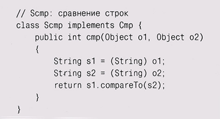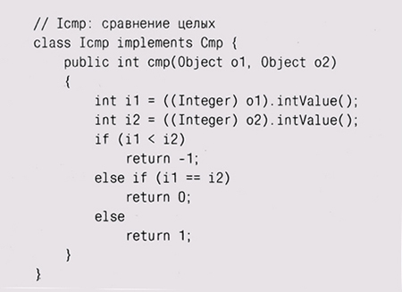 Теперь мы можем написать функции сравнения, которые реализуют этот интерфейс; например, следующий класс определяет функцию, сравнивающую объекты типа Integer: