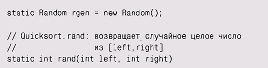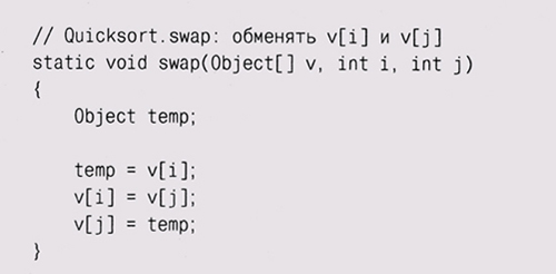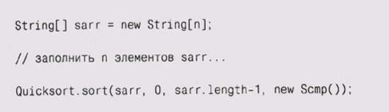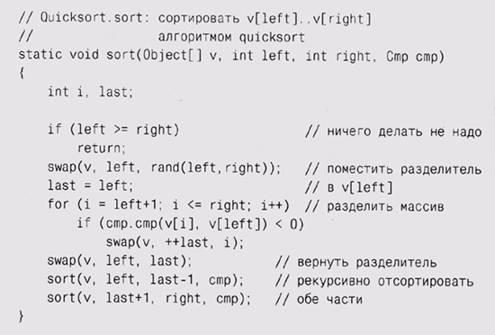 С этими компонентами мы теперь можем перенести функцию быстрой сортировки из языка С в Java и вызывать в ней функцию сравнения из объекта Стр, переданного параметром. Наиболее существенное изменение — это использование индексов left и right, поскольку в Java нет указателей на массивы.