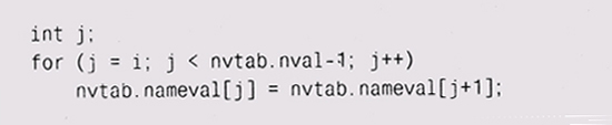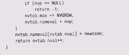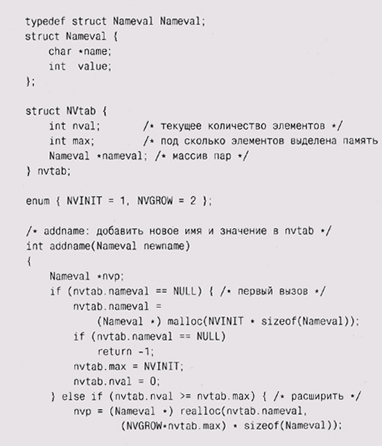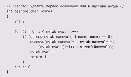 Вызов reallос увеличивает массив до новых размеров, сохраняя существующие элементы, и возвращает указатель на него или NULL при недостатке памяти. Удвоение размера массива при каждом вызове realloc сохраняет средние "ожидаемые" затраты на копирование элемента постоянными; если бы массив увеличивался каждый раз только на один элемент, то производительность была бы порядка 0(п2). Поскольку при перераспределении памяти адрес массива может измениться, то программа должна обращаться к элементам массива по индексам, а не через указатели. Заметьте, что код не таков: ? nvtab.nameval = (Nameval *) realloc(nvtab.nameval, потому что при такой форме если вызов realloc не сработает, то исход-ный-массив будет утерян. Мы задаем очень маленький начальный размер массива (NVINIT = 1). Это заставляет программу увеличивать массив почти сразу, что гарантирует проверку данной части программы. Начальное значение может быть и увеличено, когда программа начнет реально использоваться, однако затраты на стартовое расширение массива ничтожны. Значение, возвращаемое realloc, не обязательно должно приводиться к его настоящему типу, поскольку в С нетипизированные указатели (void *) приводятся к любому типу указателя автоматически. Однако в C++ это не так; здесь преобразование обязательно. Можно поспорить, что безопаснее: преобразовывать типы (это честнее и понятнее) или не преобразовывать (поскольку в преобразовании легко может закрасться ошибка). Мы выбрали преобразование, потому что тогда программа корректна как в С, так и в C++. Цена такого решения — уменьшение количества проверок на ошибки компилятором С, но это неважно, когда мы производим дополнительные проверки с помощью двух компиляторов. Удаление элемента может быть более сложной операцией, поскольку нам нужно решить, что же делать с образовавшейся "дыркой" в массиве. Если порядок элементов не имеет значения, то проще всего переставить последний элемент на место удаленного. Однако, если порядок должен быть сохранен, нам нужно сдвинуть элементы после "дырки" на одну позицию: