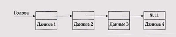 Списки По своей встречаемости в типичных программах списки занимают второе место после массивов. Многие языки имеют встроенные типы списков, некоторые, такие как Lisp, даже построены на них, но в языке С мы должны конструировать их самостоятельно. В C++ и Java работа со списками поддерживается стандартными библиотеками, но и в этом случае нужно знать их возможности и типичные применения. В данном параграфе мы собираемся обсудить использование списков в С, но уроки из этогр обсуждения можно извлечь и для более широкого применения. Простым цепным списком (single-linked list) называется последовательность элементов, каждый из которых содержит данные и указатель на следующий элемент. Головой списка является указатель на первый элемент, а конец помечен нулевым указателем. Ниже показан список из четырех элементов: