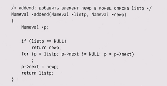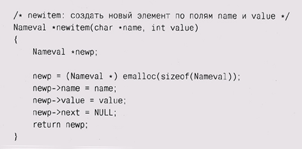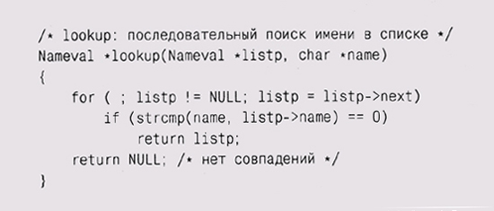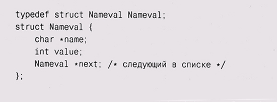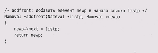 Эти различия подсказывают, что если набор данных будет часто меняться, особенно при непредсказуемом количестве элементов, то нужно использовать список; напротив, массив больше подходит для относительно статичных данных. Фундаментальных операций со списком совсем немного: добавить элемент в начало или конец списка, найти указанный элемент, добавить новый элемент до или после указанного элемента и, возможно, удалить элемент. Простота списков позволяет при необходимости легко добавлять новые операции. Вместо того чтобы определить специальный тип List, обычно в С начинают определение списка с описания типа для элементов, вроде нашего Nameval, и добавляют в него указатель на следующий элемент: