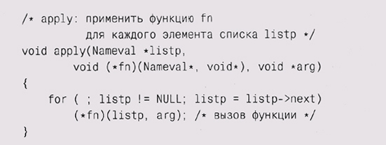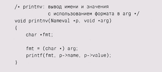 * void (*fn)(Nameval*, void*) определяет f n как указатель на функцию с возвращаемым значением типа void, то есть как переменную, содержащую адрес функции, которая возвращает void. Функция имеет два параметра — типа Nameval * (элемент списка) и void * (обобщенный указатель на аргумент для этой функции). Для использования apply, например для вывода элементов списка, мы можем написать тривиальную функцию, параметр которой будет восприниматься как строка форматирования: