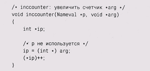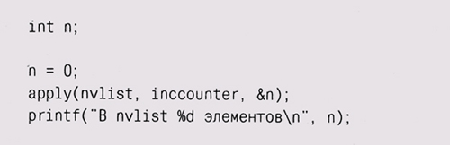 apply(nvlist, printnv, "%s: %x\n"); Для подсчета количества элементов мы определяем функцию, параметром которой будет указатель на увеличиваемый счетчик: