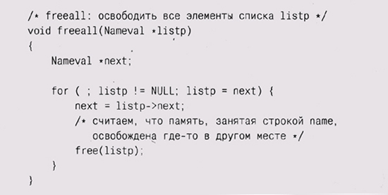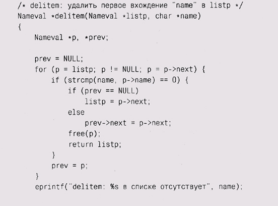 ? for ( ; listp != NULL; listp = listp->next) ? то значение listp->next могло быть затерто вызовом free и код бы не работал. Заметьте, что функция freeall не освобождает память, выделенную под строку listp->name. Это подразумевает, что поле name каждого элемента типа Nameval было освобождено где-то еще либо память под него не была выделена. Чтобы обеспечить корректное выделение памяти под элементы и ее освобождение, нужно согласование работы newitem и f гее-all; это некий компромисс между гарантиями того, что память будет освобождена, и того, что ничего лишнего освобождено не будет. Именно здесь при неграмотной реализации часто возникают ошибки. В других языках, включая Java, данную проблему за вас решает сборка мусора. К теме управления ресурсами мы еще вернемся в главе 4. Удаление одного элемента из списка — более сложный процесс, чем добавление: