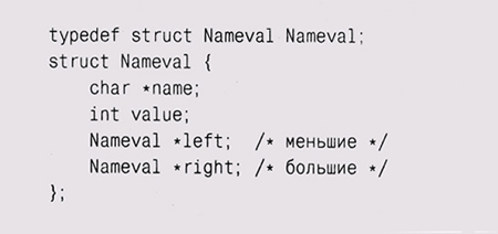 | Деревья Дерево — иерархическая структура данных, хранящая набор элементов. Каждый элемент имеет значение и может указывать на ноль или более других элементов. На каждый элемент указывает только один другой элемент. Единственным исключением является корень дерева, на который не указывает ни один элемент. Входящие в дерево элементы называются его вершинами. Есть много типов деревьев, которые отражают сложные структуры, например деревья синтаксического разбора (parse trees), хранящие синтаксис предложения или программы, либо генеалогические деревья, описывающие родственные связи. Мы продемонстрируем основные принципы на деревьях двоичного поиска, в которых каждая вершина (node) имеет по две связи. Они наиболее просто реализуются и демонстрируют наиболее важные свойства деревьев. Вершина в двоичном дереве имеет значение и два указателя, left и right, которые показывают на его дочерние вершины. Эти указатели могут быть равны null, если у вершины меньше двух дочерних вершин. Структуру двоичного дерева поиска определяют значения в его вершинах: все дочерние вершины, расположенные левее данной, имеют меньшие значения, а все дочерние вершины правее — большие. Благодаря этому свойству мы можем использовать разновидность двоичного поиска для быстрого поиска значения по дереву или определения, что такого значения нет. Вариант структуры Nameval для дерева пишется сразу: