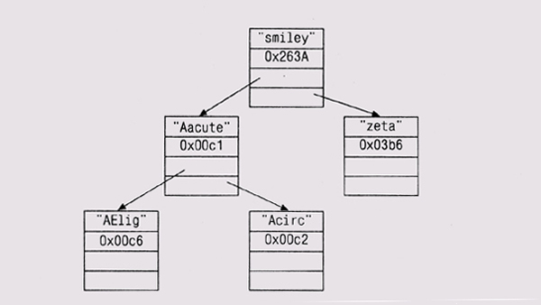 В качестве конкретного примера на приведенном рисунке показано подмножество таблицы символов в виде дерева двоичного поиска для структур Nameval, отсортированных по ASCII-значениям имен символов.