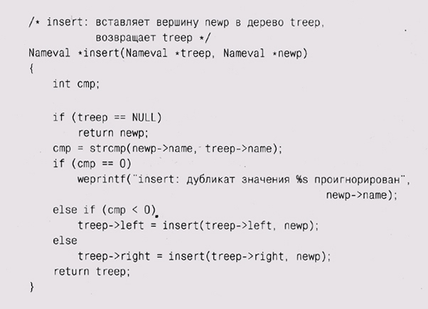 Дерево двоичного поиска (которое в данном параграфе мы будем называть просто "деревом") достраивается рекурсивным спуском по дереву; на каждом шаге спуска выбирается соответствующая правая или левая ветка, пока не найдется место для вставки новой вершины, которая должна быть корректно инициализированной структурой типа Nameval: имя, значение и два нулевых указателя. Новая вершина добавляется как лист дерева, то есть у него пока отсутствуют дочерние вершины.