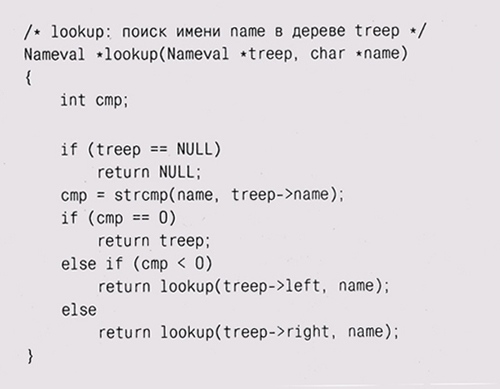 не завершает. Если элементы вставляются в дерево в том же порядке, в каком они появляются, то дерево может оказаться несбалансированным или даже весьма плохо сбалансированным. Например, если элементы приходят уже в отсортированном виде, то код каждый раз будет спускаться на еще одну ветку дерева, создавая в результате список из правых ссылок, со всеми "прелестями" производительности списка. Если же элементы поступают в произвольном порядке, то описанная ситуация вряд ли произойдет и дерево будет более или менее сбалансированным. Трудно реализовать деревья, которые гарантированно сбалансированы; это одна из причин существования большого числа различных видов деревьев. Мы просто обойдем данный вопрос стороной и будем считать, что входные данные достаточно случайны, чтобы дерево было достаточно сбалансированным. Код для функции поиска похож на функцию insert: