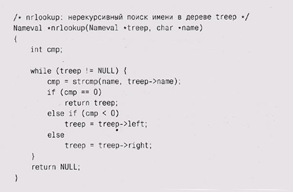 Во-вторых, эти процедуры рекурсивны. Если их переписать итеративно, то они будут похожи на двоичный поиск еще больше. На самом деле итеративная версия функции lookup может быть создана в результате элегантной трансформации рекурсивной версии. Если мы еще не нашли элемента, то последнее действие функции заключается в возврате результата, получающегося при вызове себя самой, такая ситуация называется хвостовой рекурсией (tail recursion). Эта конструкция может быть преобразована в итеративную форму, если подправить аргументы и стартовать функцию заново. Наиболее прямой метод — использовать оператор перехода goto, но цикл while выглядит чище: