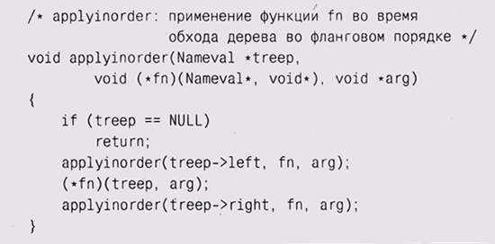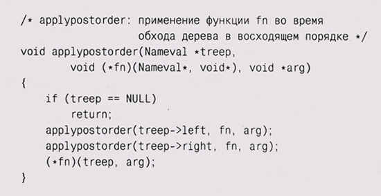 applyinorder(treep, printnv, "%s: %x\n"); Сразу намечается вариант сортировки: вставляем элементы в дерево, выделяем память под массив соответствующего размера, а затем используем фланговый обход для последовательного размещения их в массиве. Восходящий порядок (post-order) обхода вызывает операцию для данной вершины после просмотра вершин-детей: