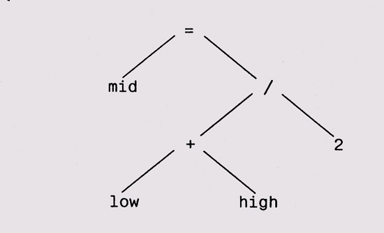 Нисходящий порядок (pre-order) используется редко, так что мы не будем его рассматривать. На самом деле деревья двоичного поиска применяются редко, хотя В-деревья, обычно сильно разветвленные, используются для хранения информации на внешних носителях. В каждодневном программировании деревья часто используются для представления структур действий и выражений. Например, действие mid = (low + high) / 2; может быть представлено в виде дерева синтаксического разбора (parse tree), показанного на рисунке ниже. Для вычисления значения дерева нужно обойти его в восходящем порядке и выполнить в каждой вершине соответствующее действие.