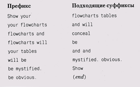 Для иллюстрации сгенерируем случайный текст, основываясь на нескольких предложениях из эпиграфа к этой главе и используя префикс из двух слов: Show your flowcharts and conceal your tables and I will be mystified. Show your tables and your flowcharts will be obvious, (end)