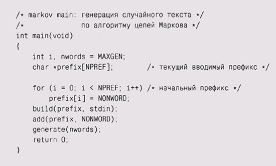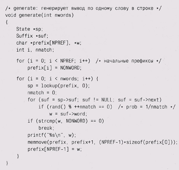 rand() увеличивает nmatch и является истинным с вероятностью 1/nmatch. Таким образом, первый подходящий элемент будет выбран с вероятностью 1, второй заменит его с вероятностью 1/2, третий заменит выбранный из предыдущих с вероятностью 1/3 и т. п. В каждый момент времени каждый из k просмотренных элементов будет выбран с вероятностью i/k. Вначале мы устанавливаем prefix в стартовое значение, которое с гарантией присутствует в хэш-таблице. Первые найденные значения Suffix будут первыми словами документа, поскольку только они следуют за стартовым префиксом. После этого суффикс выбирается случайным образом. В цикле вызывается lookup для поиска в хэш-таблице элемента (множества суффиксов), соответствующего данному префиксу; после этого случайным образом выбирается один из суффиксов, он печатается, а префикс обновляется. Если выбранный суффикс оказывается NONWORD, то все заканчивается, поскольку это означает, что мы достигли состояния, относящегося к концу введенного текста. Если суффикс не NONWORD, то мы его печатаем, а далее с помощью вызова memmove удаляем первое слово из префикса и делаем суффикс вторым словом нового префикса, после чего цикл повторяется. Теперь все написанное можно свести воедино в функцию main, которая читает стандартный ввод и генерирует не более заданного количества слов:
