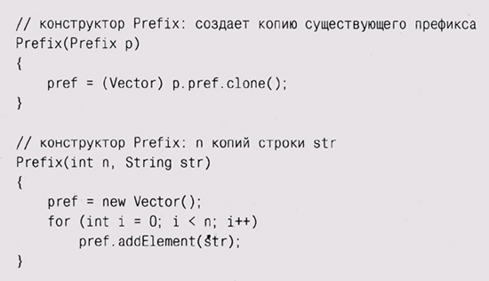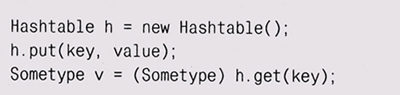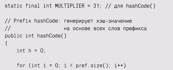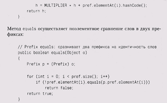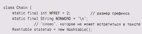 Java Вторую реализацию алгоритма markov мы создадим на языке Java. Объектно-ориентированные языки вроде Java заставляют нас обращать особое внимание на взаимодействие между компонентами программы. Эти компоненты инкапсулируются в независимые элементы данных, называемые объектами или классами; с ними ассоциированы функции, называемые методами. Java имеет более богатую библиотеку, чем С. В частности, эта библиотека включает в себя набор классов-контейнеров (container classes) для группировки существующих объектов различными способами. В качестве примера можно привести класс Vector, который представляет собой динамически растущий массив, где могут храниться любые объекты типа Object. Другой пример— класс Hashtable, с помощью которого можно сохранять и получать значения одного типа, используя объекты другого типа в качестве ключей. В нашем приложении экземпляры класса Vector со строками в качестве объектов — самый естественный способ хранения префиксов и суффиксов. Так же естественно использовать и класс Hashtable, ключами в котором будут векторы префиксов, а значениями — векторы суффиксов. Конструкции подобного рода называются отображениями (тар) префиксов на суффиксы; в Java нам не потребуется в явном виде задавать тип State, поскольку Hashtable неявным образом сопоставляет префиксы и суффиксы. Этот дизайн отличается от версии С, где мы создавали структуры State, в которых соединялись префиксы и списки суффиксов, а для получения структуры State использовали хэширование префикса. Hashtable предоставляет в наше распоряжение метод put для хранения пар ключ-значение и метод get для получения значения по заданному ключу: