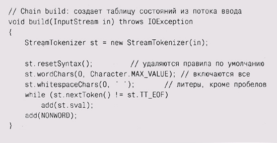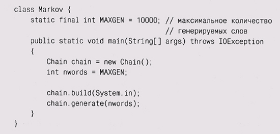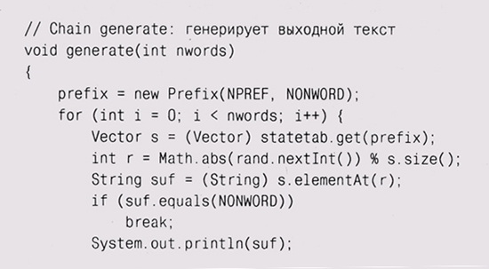 Программа на Java гораздо меньше, чем ее аналог на С, при этом больше деталей проработано в самом языке — очевидными примерами являются классы Vector и Hashtable. В общем и целом управление хранением данных получилось более простым, поскольку вектора растут, когда' нужно, а сборщик мусора (garbage collector — специальный автоматический механизм виртуальной машины Java) сам заботится об освобождении неиспользуемой памяти. Однако для того, чтобы использовать класс Hashtable, нам пришлось-таки самим писать функции hashCode и equals, так что нельзя сказать, что язык Java заботился бы обо всех деталях. Сравнивая способы, которыми программы на С и Java представляют < и обрабатывают одни и те же структуры данных, следует отметить, что в версии на Java лучше разделены функциональные обязанности. При таком подходе нам, например, не составит большого труда перейти от использования класса Vector к использованию массивов. В версии С каждый блок связан с другими блоками: хэш-таблица работает с массивами, которые обрабатываются в различных местах; функция lookup четко ориентирована на конкретное представление структур State и Suffix; размер массива префиксов вообще употребляется практически всюду. Пропустив эту программу с исходным (химическим) текстом и форматируя сгенерированный текст с помощью процедуры f mt, мы получили следующее: % Java Markov <j r^cheinistry. txt | fmt Wash the blackboard.