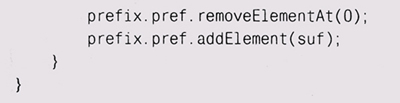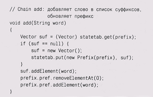 Функция add получает из хэш-таблицы вектор суффиксов для текущего префикса; если их не существует (вектор есть null), add создает новый вектор и новый префикс для сохранения их в таблице. В любом случае эта функция добавляет новое слово в вектор суффиксов и обновляет префикс, удаляя из него первое слово и добавляя в конец новое.
