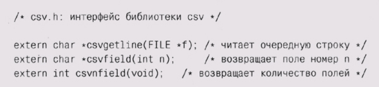 Остаток параграфа посвящен новой реализации csvgetl i ne, которая COOT- | ветствует нашей спецификации. Библиотека разбита на два файла — заголовочный csv. h и файл воплощения csv. с. В заголовочном файле содержатся объявления функций, то есть представлена общедоступная часть интерфейса. В csv. с содержится собственно рабочий код библиотеки — реализации функций. Пользователи включают csv. h в свой исходный код и компонуют свой скомпилированный код со скомпилированной версией csv. с; таким образом, исходный код библиотеки никогда не должен быть видим.