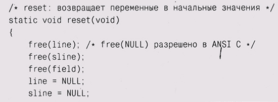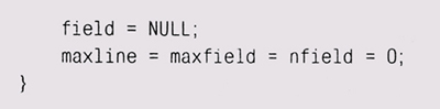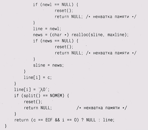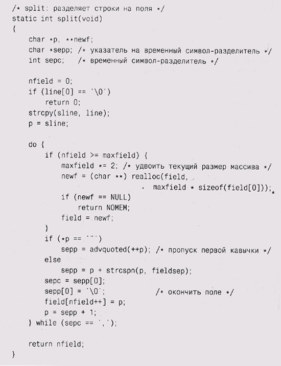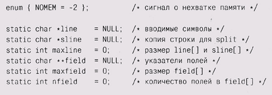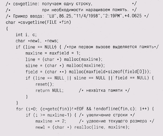 Поступающая строка накапливается в строке line, которая при необходимости наращивается, вызывая realloc; при каждом увеличении размер удваивается, как в параграфе 2.6. Массив sline всегда увеличивается до размера line; csvgetline вызывает split для создания в отдельном массиве field указателей на поля — этот массив также при необходимости наращивается. Мы привыкли начинать с очень маленьких массивов и увеличивать их по потребности, чтобы иметь гарантию, что код увеличения массива был выполнен. Если выделения памяти не происходит, мы вызываем reset для восстановления глобальных значений в их первоначальное состояние, чтобы дать шанс на успех последующему вызову csvgetline: