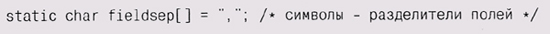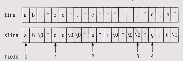 Эти объявления описывают простую структуру данных. Массив line содержит вводимую строку; массив sline создается путем копирования символов из line и вставки разделителя после каждого поля. Массив field указывает на значения в sline. На диаграмме показано состояние этих трех массивов после того, как была обработана строка ab, "cd", "e""f",, "g, h". Заштрихованные элементы в sline не являются частью какого-либо поля.