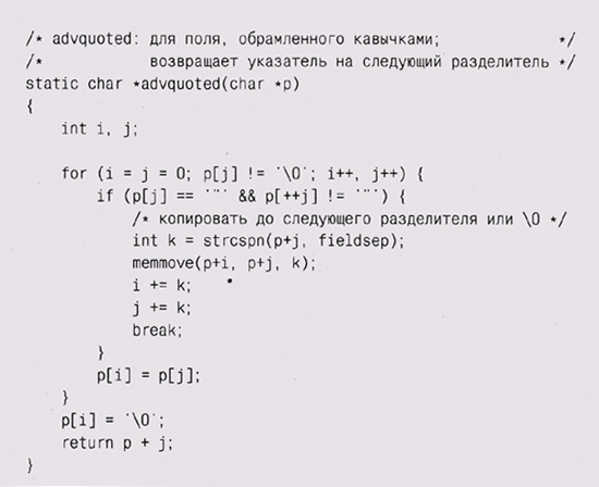 Двойные кавычки внутри поля представляются парой смежных двойных кавычек; функция advquoted сжимает такую комбинацию до одной кавычки, а также удаляет кавычки, обрамляющие поле. Дополнительный код добавлен в попытке справиться с правдоподобным вводом, не подходящим под спецификацию, — таким, например, как "abc"def. В подобных случаях мы добавляем в конец поля все, что заключено между второй кавычкой и следующим разделителем. Оказывается, Microsoft Excel использует схожий алгоритм.