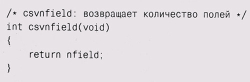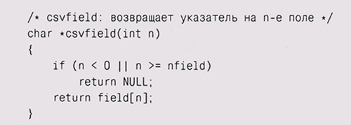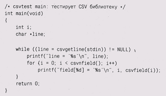 Мы будем удалять символ перевода строки из конца строки, возвращаемой csvgetline, так как, если понадобится, его можно без труда вписать обратно. С определением поля дело обстоит довольно сложно; мы попробовали собрать воедино варианты, которые встречались в электронных таблицах и других программах. Получилось примерно следующее. Поле является последовательностью из нуля или более символов. Поля разделены запятыми. Открывающие и завершающие пробелы (пропуски) сохраняются. Поле может быть заключено в двойные кавычки, в этом случае оно может содержать запятые. Поля, заключенные в двойные кавычки, могут содержать символы двойных кавычек, представляемые парой последовательных двойных кавычек, — то есть CSV поле "х""у" определяет строку х"у. Поля могут быть пустыми; поле, определяемое как "", считается пустым и эквивалентно полю, определяемому двумя смежными запятыми. Поля нумеруются с нуля. Как быть, если пользователь запросит несуществующее поле, вызвав csvfield(-l) или csvfield( 100000)? Мы могли бы возвращать "" (пустую строку), поскольку это значение можно выводить или сравнивать; программам, которые работают с различным количеством полей, не пришлось бы принимать специальных предосторожностей на случай обращения к несуществующему полю. Однако этот способ не предоставляет возможности отличить пустое поле от несуществующего. Второй вариант — выводить сообщение об ошибке или даже прерывать работу; несколько позже мы объясним, почему так делать нежелательно. Мы решили возвращать NULL — общепринятое в С значение для несуществующей строки. Сокрытие деталей. Библиотека не будет накладывать никаких ограничений ни на длину вводимой строки, ни на количество полей. Чтобы осуществить это, либо вызывающая сторона должна предоставить память, либо вызываемая сторона (то есть библиотека) должна ее зарезервировать. Посмотрим, как это организовано в сходных библиотеках: при вызове функции f gets ей передается массив и максимальный размер; если строка оказывается больше буфера, она разбивается на части. Для работы с CSV такое поведение абсолютно неприемлемо, поэтому наша библиотека будет сама выделять память по мере необходимости. Только функция csvgetline занимается управлением памятью; вне ее ничего о методах организации памяти не известно. Лучше всего осуществлять такую изоляцию через интерфейс функции: получается (то есть видно снаружи), что csvgetline читает следующую строку — вне зависимости от ее размера, csvfield(n) возвращает указатель на байты п-го поля текущей строки, a csvnf ields возвращает количество полей в текущей строке. Мы должны будем наращивать память по мере появления длинных строк или большого количества полей. Детали того, как это происходит, спрятаны в функциях csv; никакие другие части программы не знают, как это делается: использует ли библиотека маленькие массивы, наращивая их при необходимости, или, наоборот, очень большие массивы, или вообще какой-то совершенно другой подход. Точно так же интерфейс не раскрывает и того, когда же память высвобождается. Если пользователь вызывает только csvgetline, то нет надобности разделять строку на поля; это можно сделать по специальному требованию. Происходит ли разделение полей ретиво (eager, непосредственно при чтении строки), лениво (lazy, только когда нужно посчитать количество полей) или очень ленива (very lazy, выделяется т