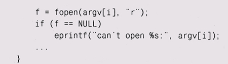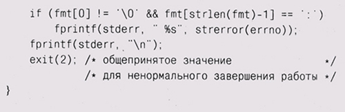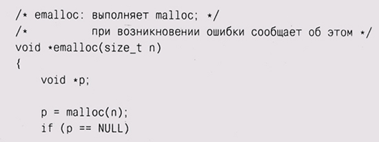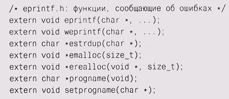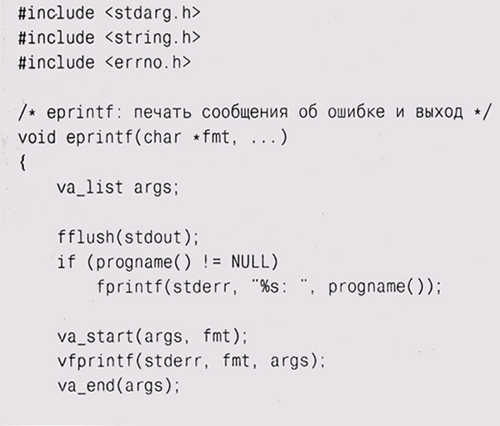 Abort, Retry, Fail? В предыдущих главах мы использовали для обработки ошибок функции вроде eprintf и estrdup — просто выводили некие сообщения перед тем, как прервать выполнение программы. Например, функция eprintf ведет себя так же, как fprintf (stderr, . . .), но после вывода сообщения выходит из программы с некоторым статусом ошибки. Она использует заголовочный файл <stdarg. h> и библиотечную функцию vfprintf для вывода аргументов, представленных в прототипе многоточием (...). Использование библиотеки stdarg должно быть начато вызовом va_start и завершено вызовом va__end. Мы еще вернемся к этому интерфейсу в главе 9.