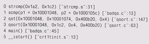 Программа была исправлена и отослана обратно, а затем пришла опять с сообщением, что программа не обрабатывала должным образом аргументы типа - f 123: преобразованное числовое значение всегда содержало ноль. Это та же самая ошибка: следующая часть оператора выбора должна была звучать так: from = atoi(&argv[i][2]); Из-за того, что автор торопился, он не заметил, что тот же самый промах произошел еще в двух местах, и понадобился еще один круг, чтобы полностью исправить все практически одинаковые ошибки. В простом коде могут быть ошибки, если привычность этого кода такова, что заставляет нас ослабить внимание. Даже если код столь прост, что вы можете написать его во сне, не засыпайте, пока его пишете. Не откладывайте отладку на потом. Чрезмерная торопливость может повредить и в других ситуациях. Не игнорируйте проявившуюся ошибку: отследите ее прямо сейчас, потому что потом она может и не возникнуть. Пример — знаменитая история, случившаяся при запуске космической станции "Mars Pathfinder". После безупречного "приземления" в июле 1997 года компьютеры станции имели обыкновение перезагружаться в среднем один раз в день, и это поставило инженеров в тупик. Когда они отследили ошибку, то поняли, что уже встречались с ней. Во время предпусковых проверок такие перезагрузки случались, но были проигнорированы, потому что инженеры работали над другими вопросами. Теперь они оказались вынуждены решать проблему, когда машина находится на расстоянии десятков миллионов километров, и исправить ошибку стало значительно труднее. Пользуйтесь стеком вызовов. Хотя отладчики умеют обращаться с программами и в процессе их работы, все же одним из основных их применений является исследование "посмертного" состояния программы. Номер строки исходного текста, в котором произошла ошибка, или, зачастую, кусок стека вызовов — это самая полезная отладочная информация. Хорошей подсказкой также бывают невероятные значения аргументов (нулевые указатели, огромные целые, тогда как они должны быть небольшими, или отрицательные, когда они должны быть положительными, строки, состоящие из неалфавитных символов). Вот типичный пример, основанный на обсуждении сортировки из главы 2. Для того чтобы отсортировать массив целых, нужно вызвать qsort с функцией сравнения целых чисел icmp: nt arr[N]; Предположим, что мы по недосмотру передаем вместо icmp функцию сравнения строк scmp: ?int arr[N]; Компилятор не может обнаружить несовпадения типов, поэтому неприятность ожидает своего часа. Когда мы запускаем программу, она "валится", пытаясь обратиться к неразрешенному адресу. Отладчик dbx выдает такую трассировку стека вызовов: