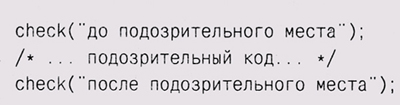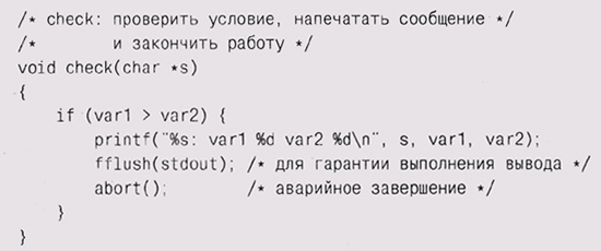 Мы сделали так, что check вызывает a bo rt, стандартную функцию библиотеки языка С, которая приводит к аварийному завершению работы программы, чтобы затем можно было проанализировать ее с отладчиком. В каком-нибудь другом случае можно просто продолжить выполнение. Теперь добавьте вызовы функции check везде, где она может быть полезна: