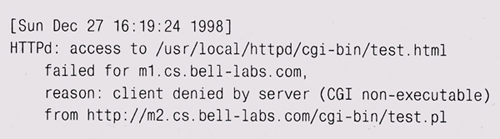 В более запутанных случаях функция check может проводить проверку и отображать структуры данных. Этот подход можно обобщить, используя процедуры, проводящие постоянную проверку целостности структур данных и другой информации. В программе со сложными структурами данных полезно написать такие проверки, поместив их в саму программу до того, как возникнут какие-нибудь проблемы, чтобы их можно было просто включить в случае чего. Используйте их не только для отладки; пусть они будут включ'ены на всех стадиях разработки программы. Если они не сильно влияют на производительность, будет разумно оставить их включенными навсегда. Большие программы типа систем телефонной коммутации часто отводят значительные куски кода "аудитным" подсистемам, которые регулярно анализируют информацию и оборудование, сообщают о встреченных ошибках или даже исправляют их. Ведите журнальный файл. Другая тактика — ведение журнального файла (log file), содержащего отладочную выдачу фиксированного формата. Когда случается "падение", журнал хранит записи, показывающие, что случилось непосредственно перед этим, web-серверы и другие сетевые программы ведут обширные журналы учета трафика, чтобы собирать информацию о клиентах и о работе программы. Вот такой фрагмент журнального файла можно было встретить на одной из наших машин: