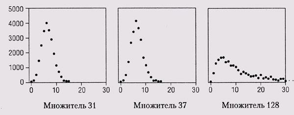 Если вы не понимаете, что происходит в вашей программе, попробуйте собрать статистику о структуре данных в ней и представить результаты графически. На приводимых графиках изображена статистика цепочек в программе markov из главы 3: по оси х показана длина цепочек, а по оси у — количество элементов в цепочках этой длины. Входные данные — наш стандартный текст, Псалмы (42 685 слов, 22 482 префикса). Первые два графика соответствуют хорошим мультипликаторам, 31 и 37, а третий — кошмарному мультипликатору 128. В первых двух случаях нет ни одной цепочки длиною больше 15 или 16, а большинство элементов хранится в цепочках из 5 или 6 элементов. В третьем случае область распределения много больше, самая длинная цепочка содержит 187 элементов, а в цепочках длиною больше 20 содержатся тысячи элементов.