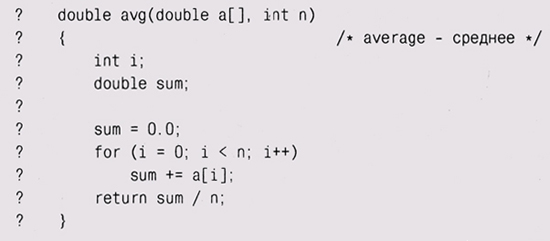 Следующим шагом будет проверка ввода около другой границы, когда массив почти заполнен, полностью заполнен и наконец переполнен, особенно если как раз в этот момент и встречается символ перевода строки. Мы не будем расписывать здесь все детали этих тестов; выполните их самостоятельно, — это очень хорошее упражнение. Задумавшись о всевозможных граничных условиях, нам придется решить, что делать в случае, если буфер заполнится до того, как во вводе встретится ' \п '; этот пробел в спецификации должен быть ликвидирован на ранней стадии написания программы. Тестирование граничных условий особенно эффективно для поиска ошибок выхода за границы массива на 1 (off-by-one errors). Попрактиковавшись, вы сделаете такую проверку своей второй натурой, и множество тривиальных ошибок будет устранено в самый момент возникновения. Тестируйте пред- и постусловия. Еще один способ предотвратить возникновение проблем — удостовериться в том, что ожидаемые или необходимые условия удовлетворяются до (предусловие) или после (постусловие) выполнения некоторого блока кода. Проверяя вводимые значения на соответствие допустимому диапазону, мы встретились как раз с примером тестирования предусловий. Ниже приведена функция для вычисления среднего из п элементов массива. При значениях л, меньших или равных 0, функция работает некорректно: