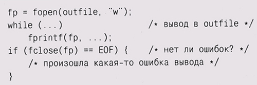 Это пример защитного программирования (defensive programming), при котором вы убеждаетесь в том, что программа защищена от неправильного использования или некорректных данных. Пустые указатели, индексы вне диапазона, деление на ноль и другие ошибки можно обнаружить на ранних стадиях жизни программы или нейтрализовать. Если бы все программисты применяли принципы защитного программирования, с Yorktown ничего бы не произошло, что бы там ни вводил оператор. Проверяйте коды возврата функций. Одним из приемов защиты, которым программисты почему-то незаслуженно пренебрегают, является проверка возвращаемого значения библиотечных функций и системных вызовов. Значения, возвращаемые функциями, обслуживающими ввод, такими как f read и fscant, надо всегда проверять. Также обязательно надо проверять и возвращаемые значения вызовов открытий файлов типа f open. Если чтение или открытие файла по каким-то причи- i нам не выполняется, не может быть и речи о нормальном продолжении работы программы. Проверка возвращаемого значения функций вывода типа f p rintf или fwrite поможет поймать ошибки, происходящие при попытке записи в файл, когда свободного места на диске не осталось. Также полезно на всякий случай проверить значение, возвращаемое fclose, — если при выполнении произошла какая-нибудь ошибка, эта функция возвратит EOF, в противном случае возвращается ноль.