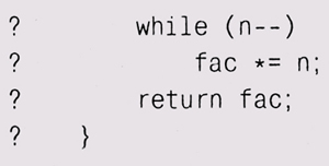 Усилия, потраченные на тестирование кода при написании, минимальны и окупаются сторицей. Мысли о тестировании в момент написания улучшают код, так как в, этот момент вы яснее всего отдаете себе отчет в том, что он должен делать. Если же вы начинаете проверку только после того, как что-нибудь сломается, то к этому моменту вы можете забыть, как код работает. Работая под давлением, вам будет трудно восстановить всю картину заново, что отнимет много времени, а внесенные исправления окажутся менее продуманными и, следовательно, менее эффективными, поскольку ваше понимание, скорее всего, окажется неполным. Упражнение 6-1 Проверьте приводимые фрагменты на граничные условия и при необходимости исправьте их, руководствуясь принципами хорошего стиля, изложенными в главе 1, и советами из этой главы. 1. Этот код должен вычислять факториалы: