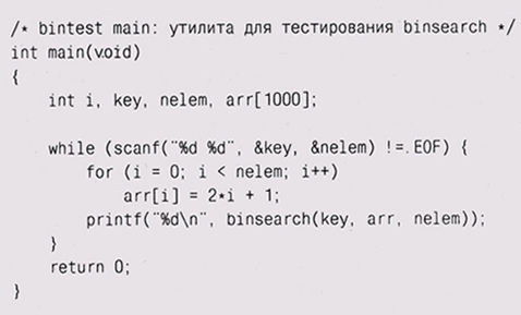 Приведенный набор тестов достаточно мал, чтобы выполнять их все вручную, но лучше создать оснастку (test scaffold — подмости тестирования) для механизации процесса. С этой целью мы напишем простейшую программу (по сути, драйвер). Она будет считывать строки, содержащие ключ, по которому будет производиться поиск, и размер массива; после этого будет создан массив указанного размера, содержащий значения 1, 3, 5 и т. п.; результат поиска будет выводиться на экран.