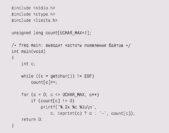 Если в программе выполняются какие-то обратимые действия, убедитесь, что вы можете обратить данные в исходное состояние. Шифровка и дешифровка во многих случаях обратимы; если вы что-то зашифровали и не смогли расшифровать, значит, что-то тут не так. То же самое относится и к программам сжатия данных. Иногда существует несколько способов обратного преобразования — тогда необходимо проверить все комбинации. Проверяйте свойства сохранности данных. Многие программы сохраняют некоторые свойства вводимых данных. Инструменты вроде we (подсчитывает строки, слова и символы) и sum (вычисляет контрольную сумму) помогут удостовериться в том, что вывод имеет тот же размер, то же количество слов или те же байты в некотором порядке и т. п. Другие программы проверяют файлы на идентичность (стр) или перечисляют их различия (cliff). Эти программы (или сходные с ними) доступны в большинстве сред программирования, и пренебрегать ими не стоит. Программа определения частоты появления байтов может быть использована для проверки сохранности данных; кроме того, она может выявить аномалии вроде наличия нетекстовых символов в текстовых файлах. Вот версия такой программы, которую мы назвали f req: