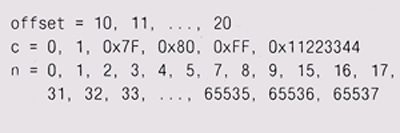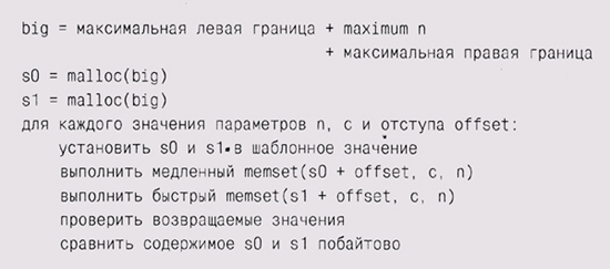 Тестирование базируется на комбинации всесторонних проверок (в частности, естественно, проверок граничных условий в потенциально опасных точках). Для memset граничными, очевидно, являются такие значения п, как ноль, один и два, числа, являющиеся степенями двойки, а также соседние с ними значения — от самых маленьких до громадных, вроде 216, что соответствует естественной границе во многих машинах — 16-битовому слову. Степени двойки привлекают внимание из-за того, что один из способов ускорить работу memset — устанавливать одновременно несколько байтов; это может быть выполнено с помощью специальных инструкций или посредством установки сразу не байта, а слова. Также надо проверять начальные значения массивов при различных выравниваниях — на случай, если ошибка возникает из-за стартового адреса или длины. Мы поместим используемый массив внутрь большего массива, создав тем самым некую буферную зону, или запасной отступ с каждой стороны — для того, чтобы можно было не особо ограничивать себя в выборе выравнивания. Кроме перечисленного нам надо проверить еще множество значений для с — включая ноль, Ox7F (самое большое значение для числа со знаком при 8-битовых байтах)-, 0x80 и OxFF (проверяя на потенциальные ошибки, связанные со знаковыми и беззнаковыми символами) и значения, превышающие один байт (чтобы удостовериться, что используется только один байт). Нам надо также записать в память некий шаблон, отличающийся от любого из этих значений, — с тем чтобы иметь возможность проверить, не производила ли memset запись вне границ предназначенной области. Мы можем использовать нашу простую реализацию как стандарт для сравнения в тесте, который размещает в памяти два массива, а затем сравнивает поведение разных реализаций при разных значениях п, с и отступа внутри массива: