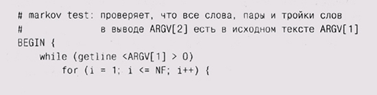 Тестирование программы markov Программа ma rkov из главы 3 достаточно сложна, поэтому ее надо особенно тщательно оттестировать. Производит она белиберду, которую трудно проверить на корректность, и, кроме того, мы написали несколько версий на разных языках. И последнее затруднение — вывод программы случаен по определению, и по идее при каждом запуске должен изменяться. Как же применить уроки данной главы к тестированию такой программы? Первый набор тестов состоит из нескольких крошечных файлов — для проверки граничных условий. Цель этого этапа — убедиться в том, что программа работает нормально при вводе размером всего в несколько слов. Для префиксов длиной два мы использовали пять файлов, содержащих, соответственно (по одному слову-символу на строку!):