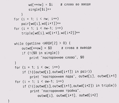 Второй тест проверял сохранность данных. Для префиксов из двух слов каждое слово, каждая пара слов и каждая тройка слов в выходном тексте должны содержаться также и во введенном тексте. Мы написали программу на Awk, которая считывает входной текст в гигантский массив, строит массивы пар и троек слов, потом считывает вывод программы в другой массив и сравнивает массивы: