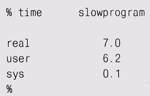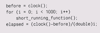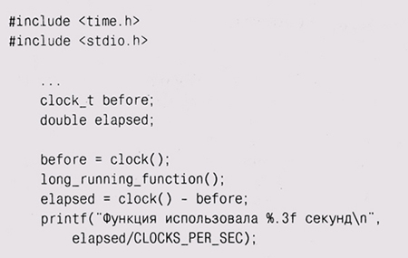 Если в вашей системе нет команды time или вы хотите замерить время работы отдельно взятой функции, не так трудно создать себе оснастку для таких замеров — по аналогии с тестовой оснасткой. В С и C++ существует стандартная функция clock, которая сообщает, сколько процессорного времени программа использовала до текущего момента. Ее можно вызвать перед интересующей вас функцией и после нее и таким образом вычислить время ее исполнения процессором: