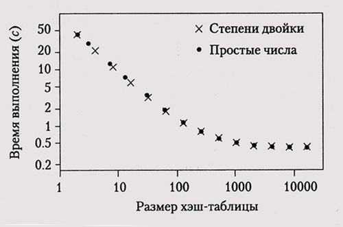 Весьма поучительно будет потратить некоторое время на сравнение счетчиков циклов и количества вызовов различных функций в двух профилях. Отметьте, что количество" вызовов strlen упало от нескольких миллионов до 652, a strncmp и memcmp вызываются одинаковое количество раз. Обратите внимание и на то, что isspam, которая сейчас взяла на себя и функцию st rch r, умудряется обойтись гораздо меньшим количеством циклов благодаря тому, что она проверяет на каждом шаге только нужные образцы. Изучение чисел может раскрыть и многие другие детали хода выполнения программы. "Горячая точка" нередко может быть уничтожена или, по крайней мере, существенно "охлаждена" гораздо более простыми способами, чем мы применили для спам-фильтра. Когда-то давным-давно профилирование Awk показало, что одна функция вызывается примерно миллион раз — в таком цикле: ? for (j ='i; j < MAXFLD; j++) Выполнение этого цикла, в котором поля очищались перед считыванИем каждой новой строки ввода, занимало почти 50 % от всего времени исполнения. Константа MAXFLD — максимальное количество полей в строке ввода — была равна 200. Однако в большинстве случаев использования Awk реальное количество полей не превышало двух-трех. Таким образом, огромное количество времени тратилось на очистку полей, которые никогда и не устанавливались. Замена константы на предыдущее значение максимального количества полей дало выигрыш в скорости 25 %. Все исправления свелись к изменению верхней границы цикла: for (j = i; j < rnaxfld; j++) Постройте график. Особенно удачным получается представление замеров производительности в виде графиков. Графики помогут более наглядно представить информацию о влиянии изменения параметров, сравнить алгоритмы и структуры данных, а иногда и указать на неожиданное поведение программы. Графики длин цепочек для нескольких хэш-мультипликаторов в главе 5 явно продемонстрировали преимущества одних мультипликаторов перед другими. На представленном ниже графике показано влияние размера массива хэш-таблицы на время исполнения С-версии программы ma rkov; в качестве вводимого текста использовались Псалмы (42 685 слов, 22 482 префикса)., Мы поставили два эксперимента. В первой серии запусков программа использовала размеры массивов, которые являлись степенями двойки — от 2 до 16 384; в другой версии использовались размеры, которые являлись максимальным простым числом, меньшим каждой степени двойки. Мы хотели посмотреть, приведет ли использование простых чисел в качестве размеров массивов к ощутимой разнице в производительности.