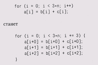 Настройка кода Существует большое количество различных способов уменьшить время исполнения, — естественно, после того как критическое место в программе найдено. Ниже мы приводим ряд рекомендаций в этой области, однако надо всегда помнить, что применять что бы то ни было надо с осторожностью и после каждого изменения непременно выполнять возвратные тесты, чтобы быть уверенными в корректности работы кода. Помните, что хорошие компиляторы сами выполняют некоторые из описываемых усовершенствований, и вы можете только запутать программу. Что бы вы ни применяли, после каждого изменения выполняйте замеры времени. Объединяйте общие выражения. Если некоторое сложное вычисление встречается в вашем коде несколько раз, выполните его единожды и запомните результат. Например, в главе 1 мы показали вам макрос, который вычислял расстояние, дважды подряд вызывая sq rt с одинаковыми значениями; в результате вычисление выглядело так: ? sqrt(dx*dx + dy*dy) + ((sqrt(dx*dx + dy*dy) > 0) ? ... ) Вычислите корень один раз, а дальше используйте полученное значение. Если вычисление выполняется в цикле, но при этом не зависит ни от каких параметров, изменяющихся в этом цикле, вынесите его из цикла и подставляйте далее его значение: for (i = 0; i < nstarting[cj; можно заменить на n = nstarting[c] ; Заменяйте дорогостоящие операции на более дешевые. Термин понижение мощности (reduction of strength) относится к такому виду оптимизации, как замена дорогостоящей операции на более дешевую. Когда-то давно этот термин обозначал в основном замену умножения сложениями или сдвигами, правда, сейчас непосредственно на этом вы вряд ли что-то выгадаете. Однако деление и взятие остатка гораздо медленнее умножения, так что код можно несколько улучшить, заменив деление умножением на обратное значение, а взятие остатка при делителе, являющемся степенью двойки, можно заменить использованием битовой маски. Замена индексации массивов указателями в С или C++ может ускорить код, правда, большинство компиляторов выполняет это автоматически. Может быть вполне выгодной и замена вызова функции простым непосредственным вычислением. Расстояние на плоскости определяется по формуле sqrt(dx*dx+dy*dy), так что для выяснения того, какая из двух точек находится дальше, в принципе надо вычислить два квадратных корня. Но это решение можно принять и сравнивая квадраты расстояний, то есть if (dx1*dx1+dy1*dy1 < dx2*dx2+dy2*dy2) даст тот же результат, но без вычисления корней. Другой пример дают сравнения строк с текстовыми образцами, вро-| де нашего спам-фильтра или д rep. Если образец начинается с буквы, то по всему введенному тексту осуществляется быстрый поиск этой буквы, и если вхождений не обнаружено, то более сложные механизмы поиска вообще не вступают в дело. Избавьтесь от циклов или упростите их. Организация и исполнение цикла требуют некоторых временных затрат, так что, если тело цикла не слишком длинно и выполняется не слишком много раз, может оказаться более эффективным избавиться от цикла вообще и выписать все дей-| ствия последовательно. Таким образом, например, for (i =0;