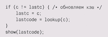 Лучше всего, если операция кэширования будет невидима снаружи, то есть не будет влиять на программу никаким образом, кроме как ускорять ее исполнение. В случае с нашим предпечатным просмотром интерфейс функции отрисовки не изменился, вызов всегда выглядел как drawchar(c); В исходной версии drawchaг осуществлялся вызов show(lookup(c)). В реализации с кэшированием для запоминания последнего вызванного символа и его кода использовались внутренние статические переменные: