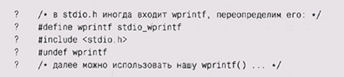 Заголовочные файлы также иногда "засоряют" пространство имен, определяя функции с именами, уже использующимися в программе. Например, наша функция оповещения об ошибках wep rintf изначально называлась wp rintf, однако мы выяснили, что в некоторых средах функция с таким именем определена в stdio. h (можно сказать, что сделано это в преддверии нового стандарта С). Для того чтобы скомпилировать программу в этих средах и защитить себя в будущем, нам пришлось изменить название своей функции. Если бы проблема состояла в некорректном компиляторе, а не в ожидаемом изменении спецификации, как в нашем случае, то ее можно было бы решить, переопределяя имя при подключении заголовочного файла: