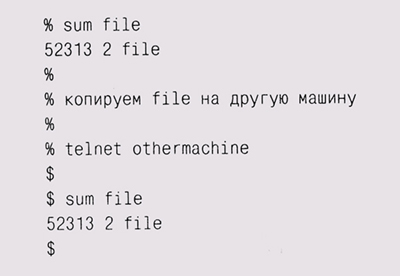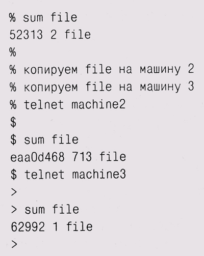Система разрасталась, появлялись новые версии, и в какой-то момент кто-то решил, что алгоритм вычисления контрольной суммы не идеален, и sum была изменена с использованием лучшего алгоритма. Кто-то еще пришел к тому же выводу и тоже изменил sum, реализовав другой, столь же хороший алгоритм, и т. д. В результате сейчас имеется несколько версий sum, каждая из которых выдает свой вариант ответа. Мы поставили ссперимент, скопировав некий файл на другие машины, чтобы выяснить, жие же результаты покажет sum в каждом конкретном случае: