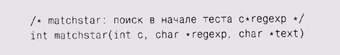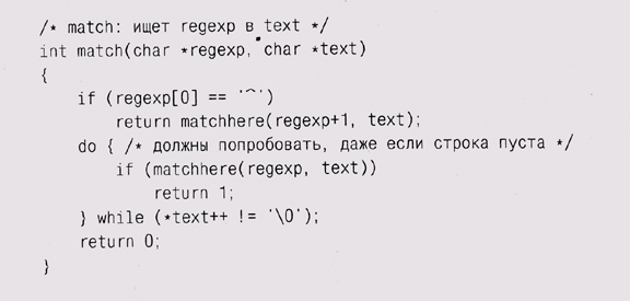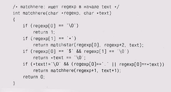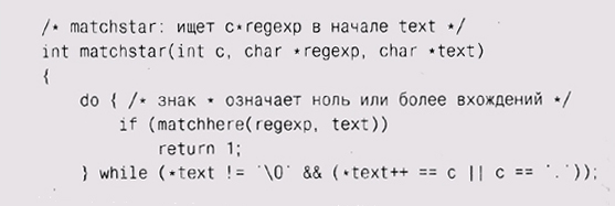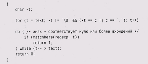 Отметьте, что matchhe re, убедившись в совпадении одного символа из; шаблона и подстроки, вызывает себя самое, таким образом, глубина ре] курсии может быть такой же, как и длина шаблона (при полном соответветствии). Единственный сложный случай представляет собой выражение, начинающееся с символа и звездочки, например х*. В этом случае мы осуществляем вызов matchstar, где первым аргументом является операнд звездочки (то есть х), а следующими аргументами — шаблон после звездочки и сам текст.